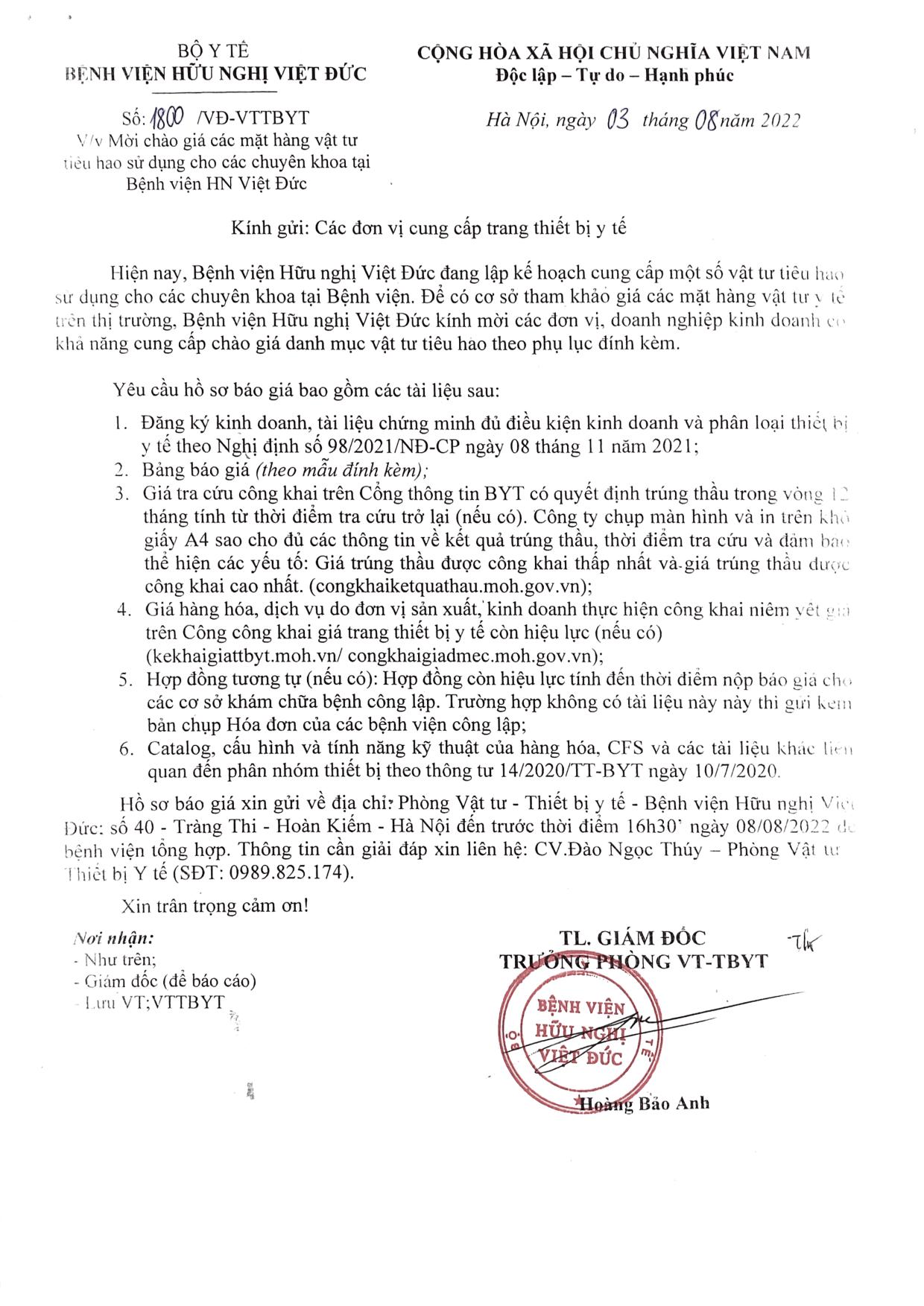 Bệnh viện HN Việt Đức trân trọng thông báo và kính mời các Công ty gửi bản chào giá các danh mục (chi tiết kèm theo) để Bệnh viện có…