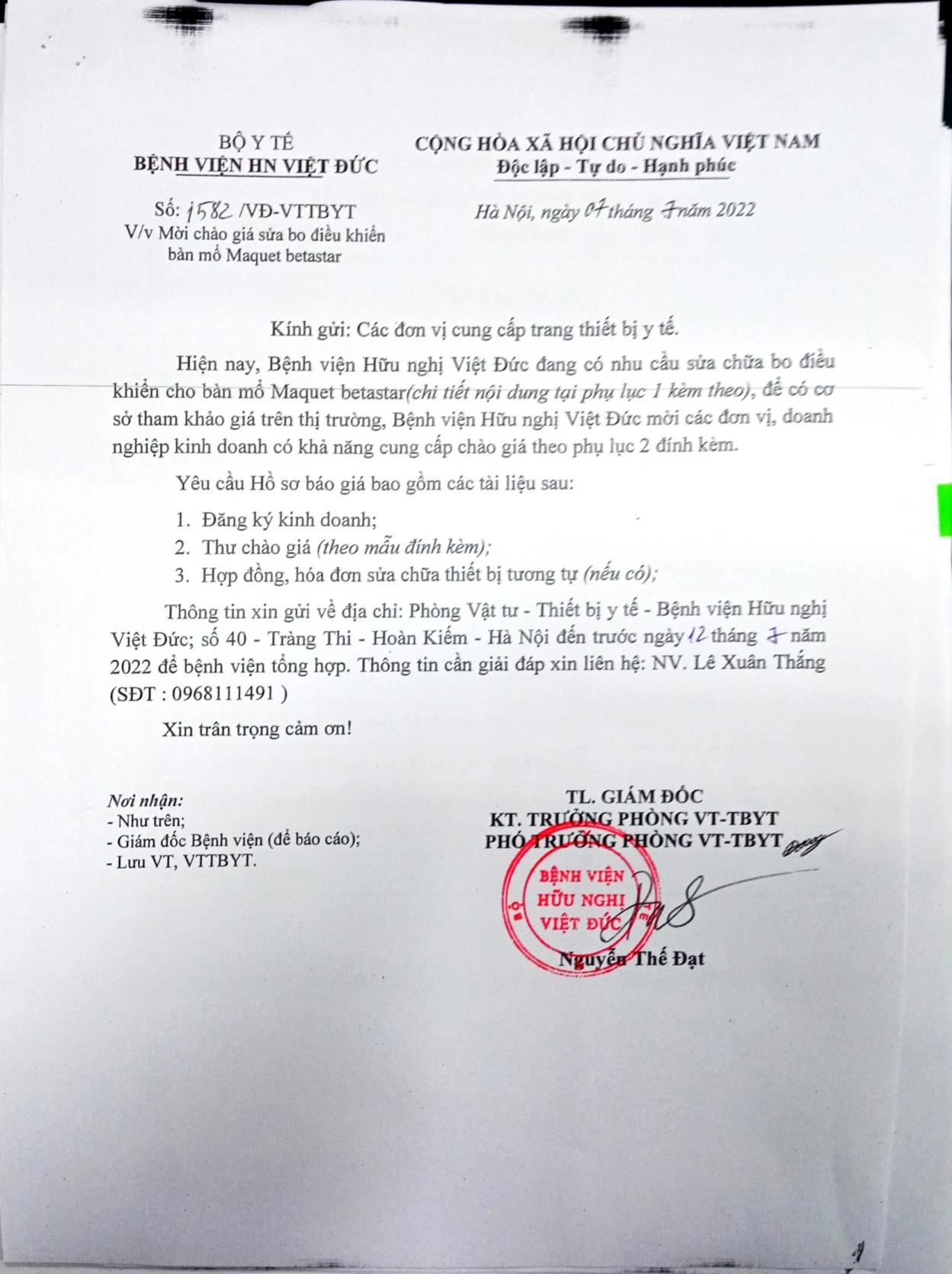 Hiện nay, Bệnh viện Hữu nghị Việt Đức đang có nhu cầu sửa chữa bo điều khiển cho bàn mổ Maquet betastar(chi tiết nội dung tại phụ lục 1 kèm…