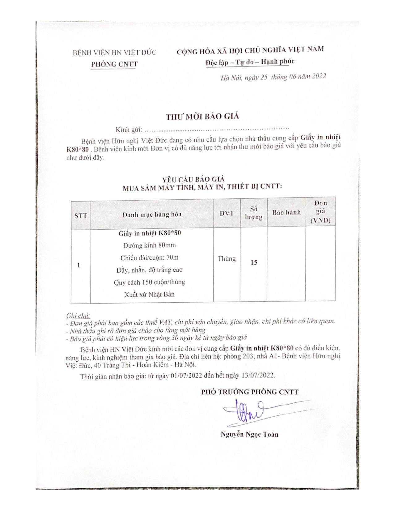 Bệnh viện Hữu nghị Việt Đức mời chào giá Giấy in nhiệt K80*80
