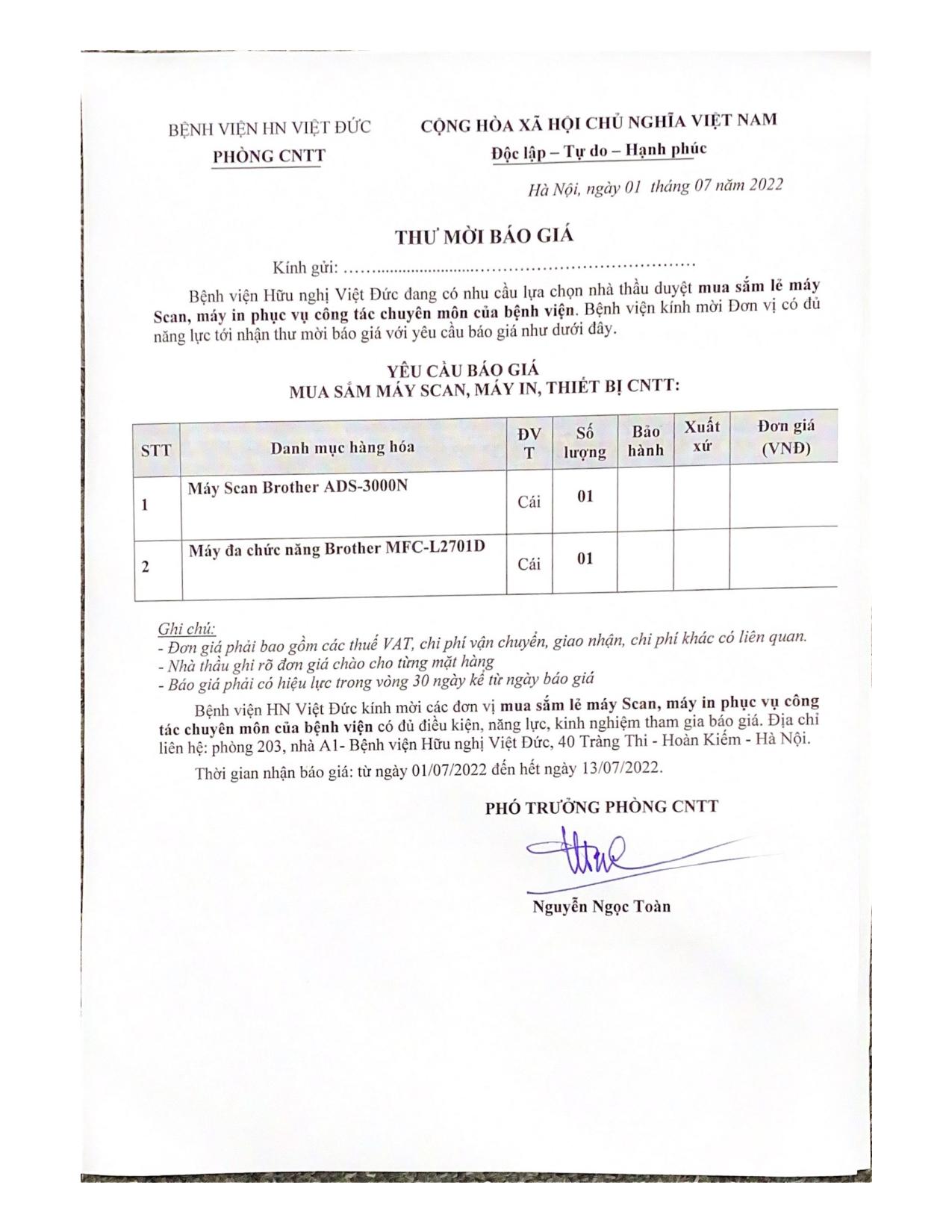 Bệnh viện Hữu nghị Việt Đức mời chào giá mua sắm lẻ máy Scan, máy in phục vụ công tác chuyên môn của bệnh viện