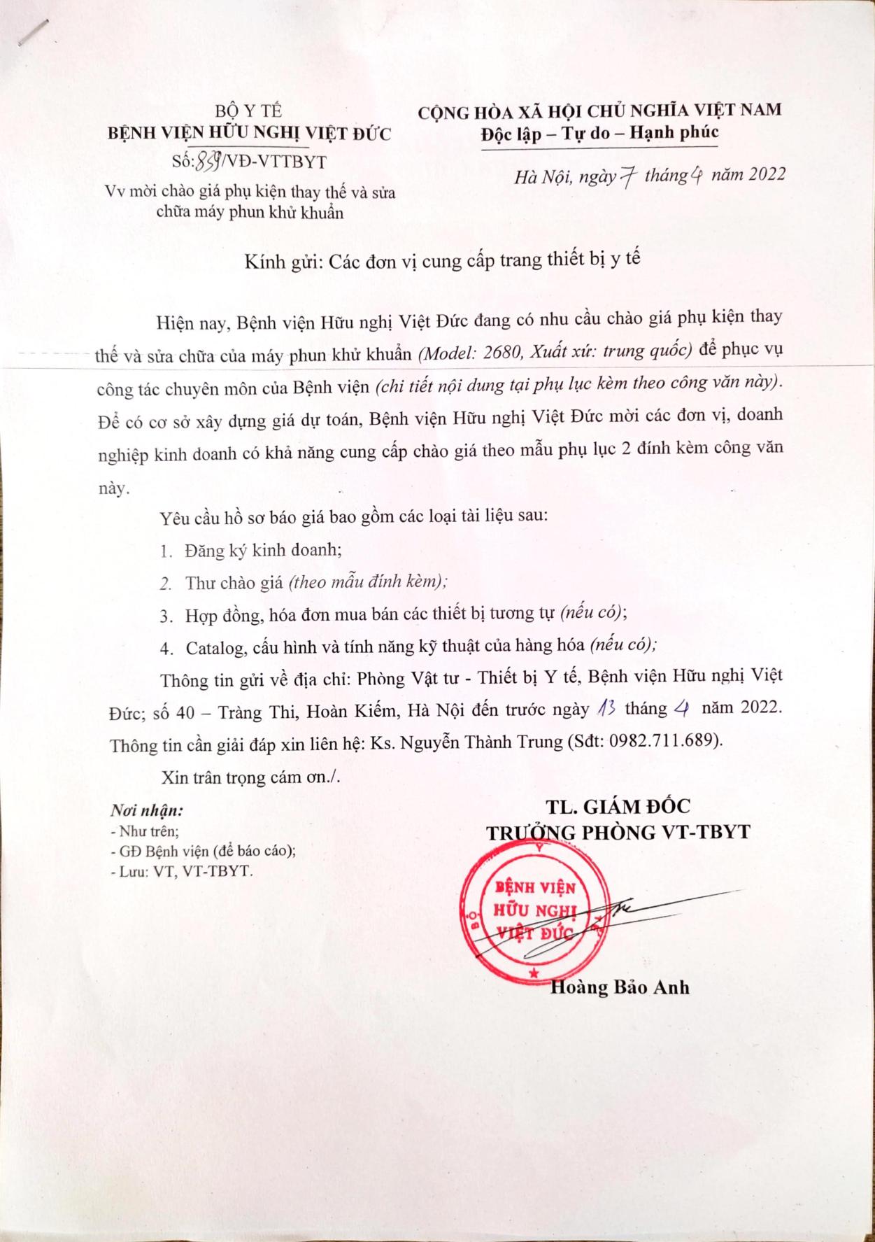 Bệnh viện Hữu nghị Việt Đức mời chào giá phụ kiện thay thế và sửa chữa máy phun khử khuẩn