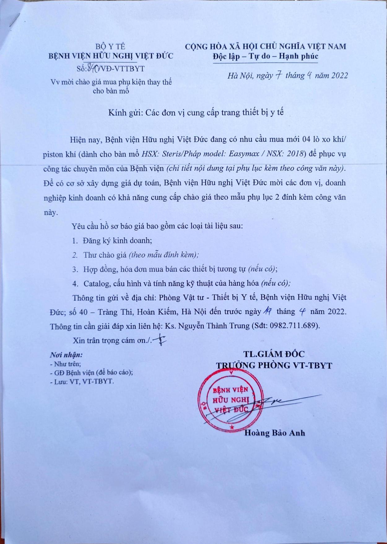 Bệnh viện Việt Đức mời chào giá mua phụ kiện thay thế cho bàn mổ