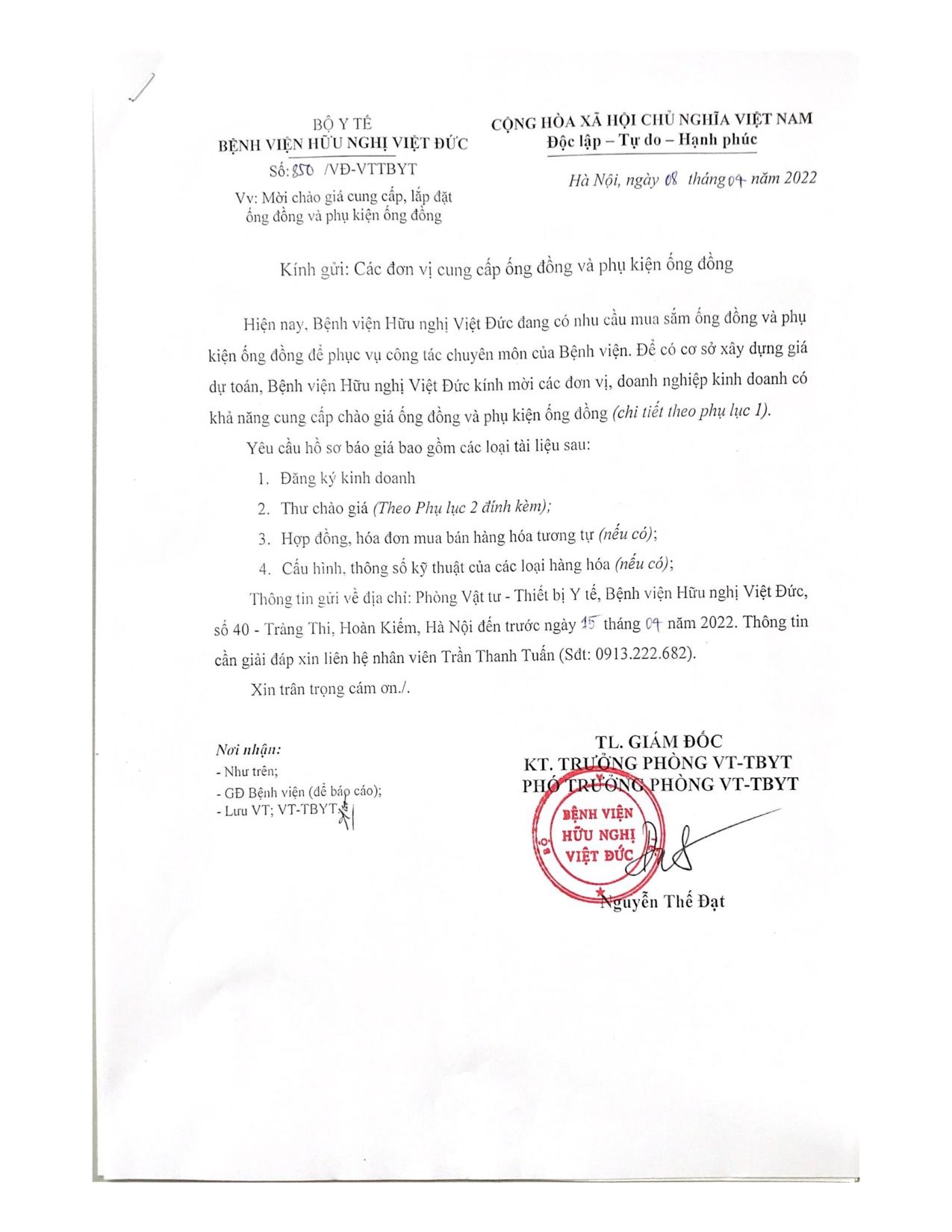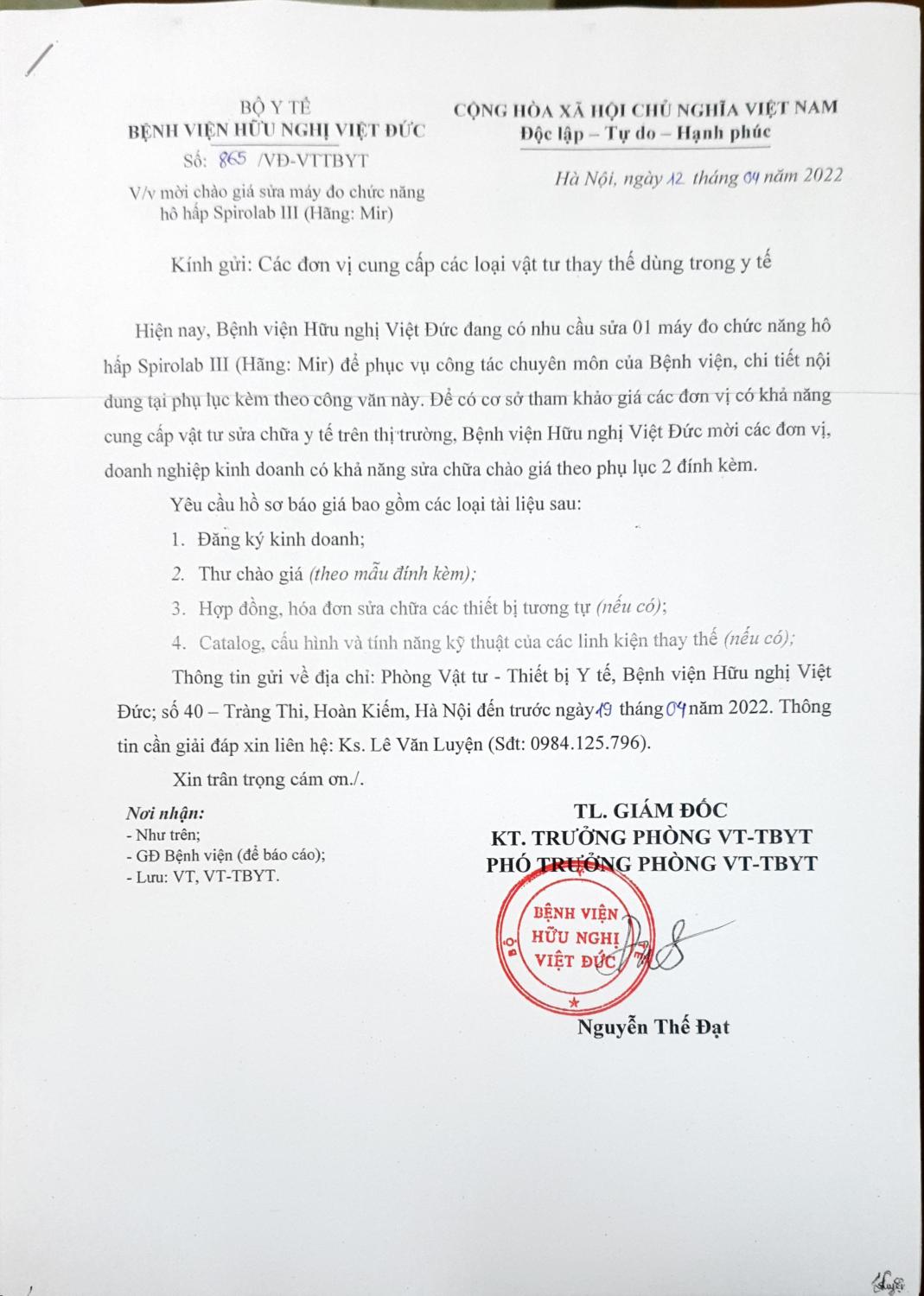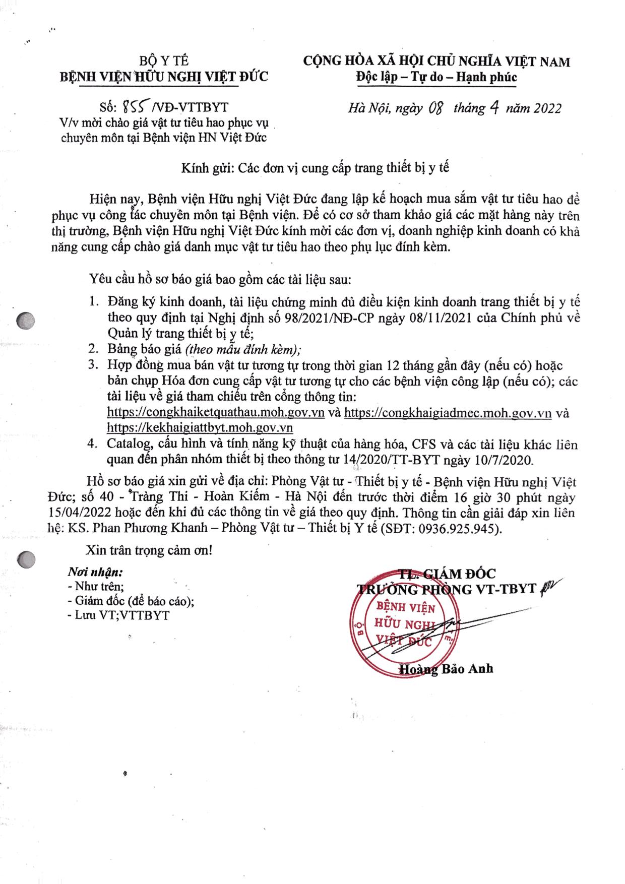 Bệnh viện Hữu nghị Việt Đức mời chào giá các mặc hàng trang thiết bị y tế