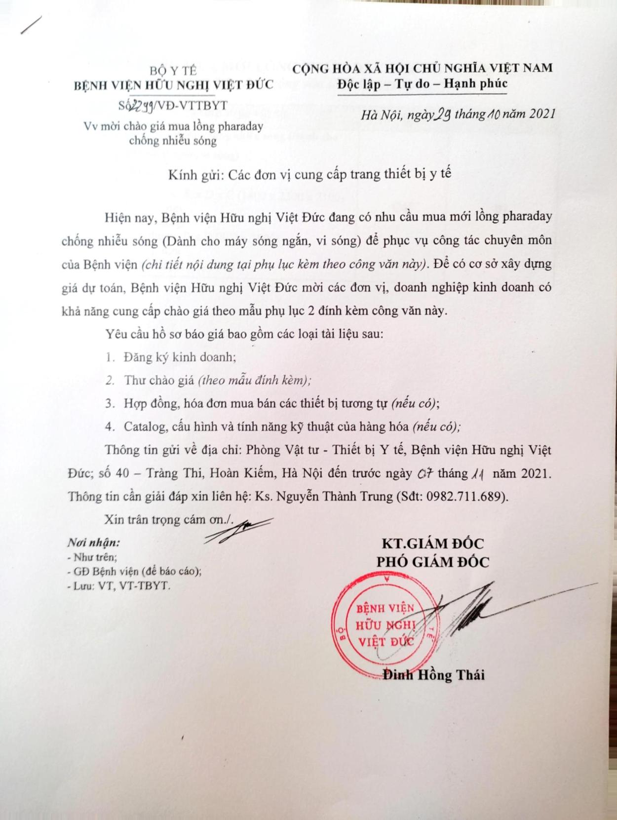 Hiện nay, Bệnh viện Hữu nghị Việt Đức đang có nhu cầu mua mới lồng pharaday chống nhiễu sóng (Dành cho máy sóng ngắn, vi sóng) để phục vụ công…