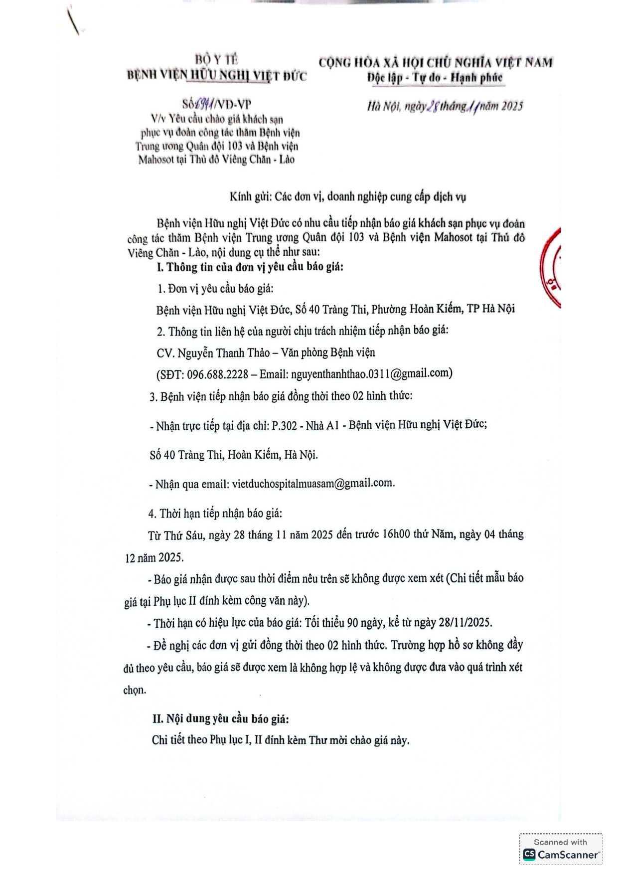 Bệnh viện Hữu nghị Việt Đức mời chào báo giá khách sạn phục vụ đoàn công tác thăm Bệnh viện Trung ương Quân đội 103 và Bệnh viện Mahosot tại Thủ đô Viêng Chăn – Lào