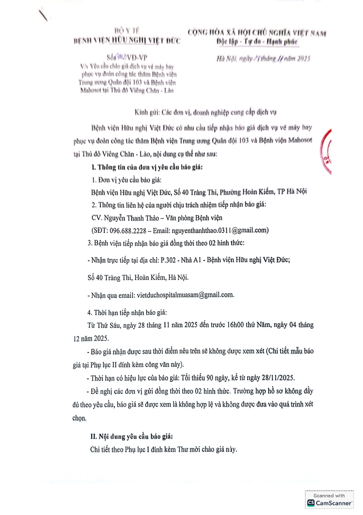 Bệnh viện Hữu nghị Việt Đức mời chào báo giá dịch vụ vé máy bay phục vụ đoàn công tác thăm Bệnh viện Trung ương Quân đội 103 và Bệnh viện Mahosot tại Thủ đô Viêng Chăn – Lào