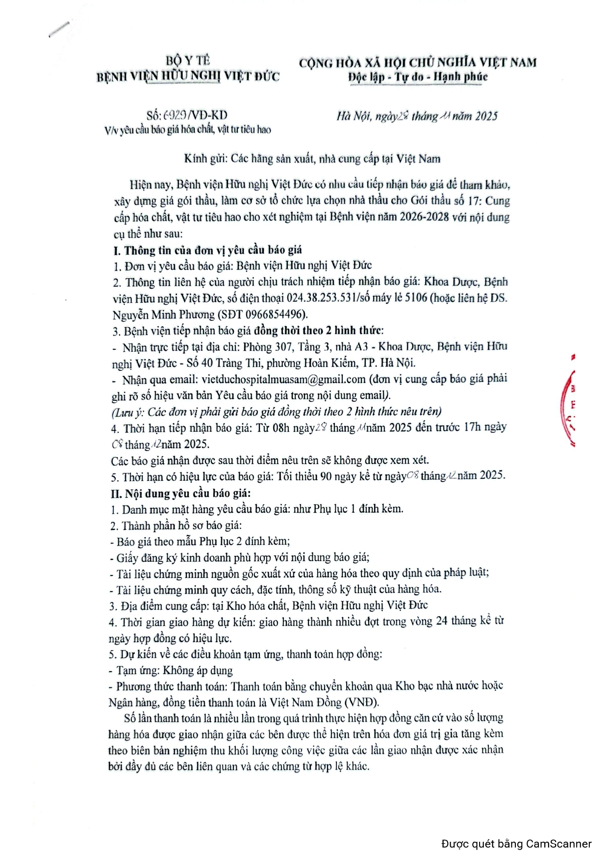 Bệnh viện HN Việt Đức yêu cầu báo giá Gói thầu số 17: Cung cấp hóa chất, vật tư tiêu hao cho xét nghiệm tại Bệnh viện năm 2026-2028