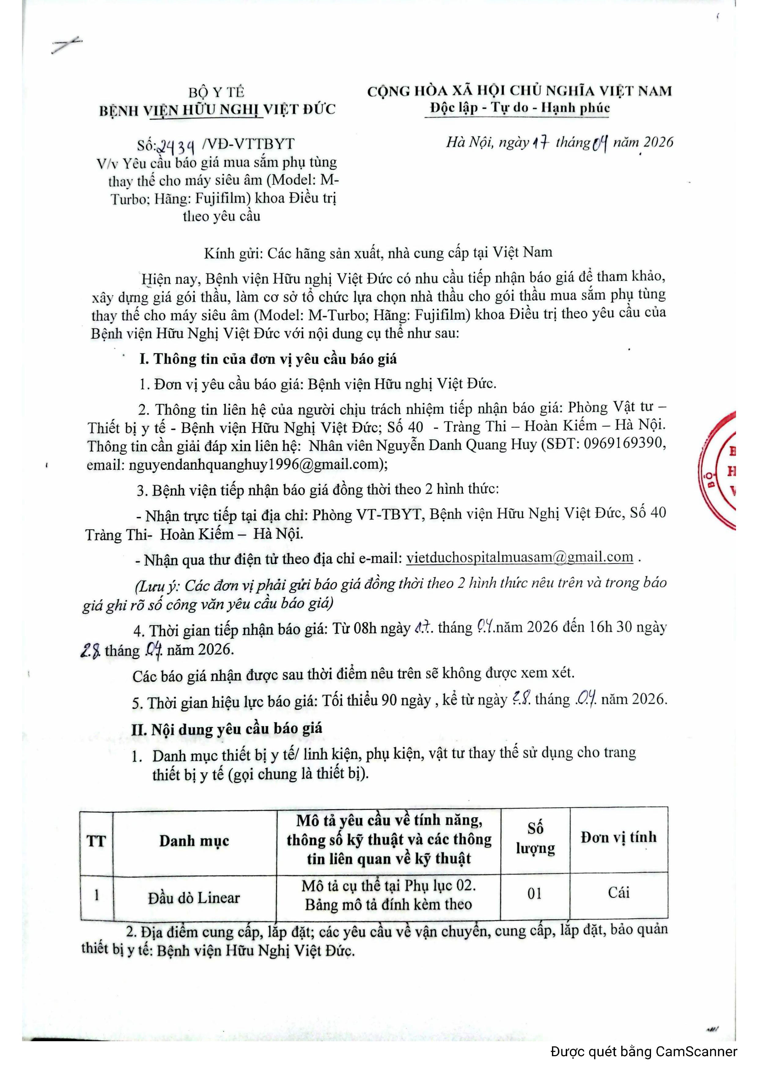 Bệnh viện Hữu nghị Việt Đức có nhu cầu yêu cầu báo giá mua sắm phụ tùng thay thế cho máy siêu âm (Model: M-Turbo; Hãng: Fujifilm) khoa Điều trị theo yêu cầu