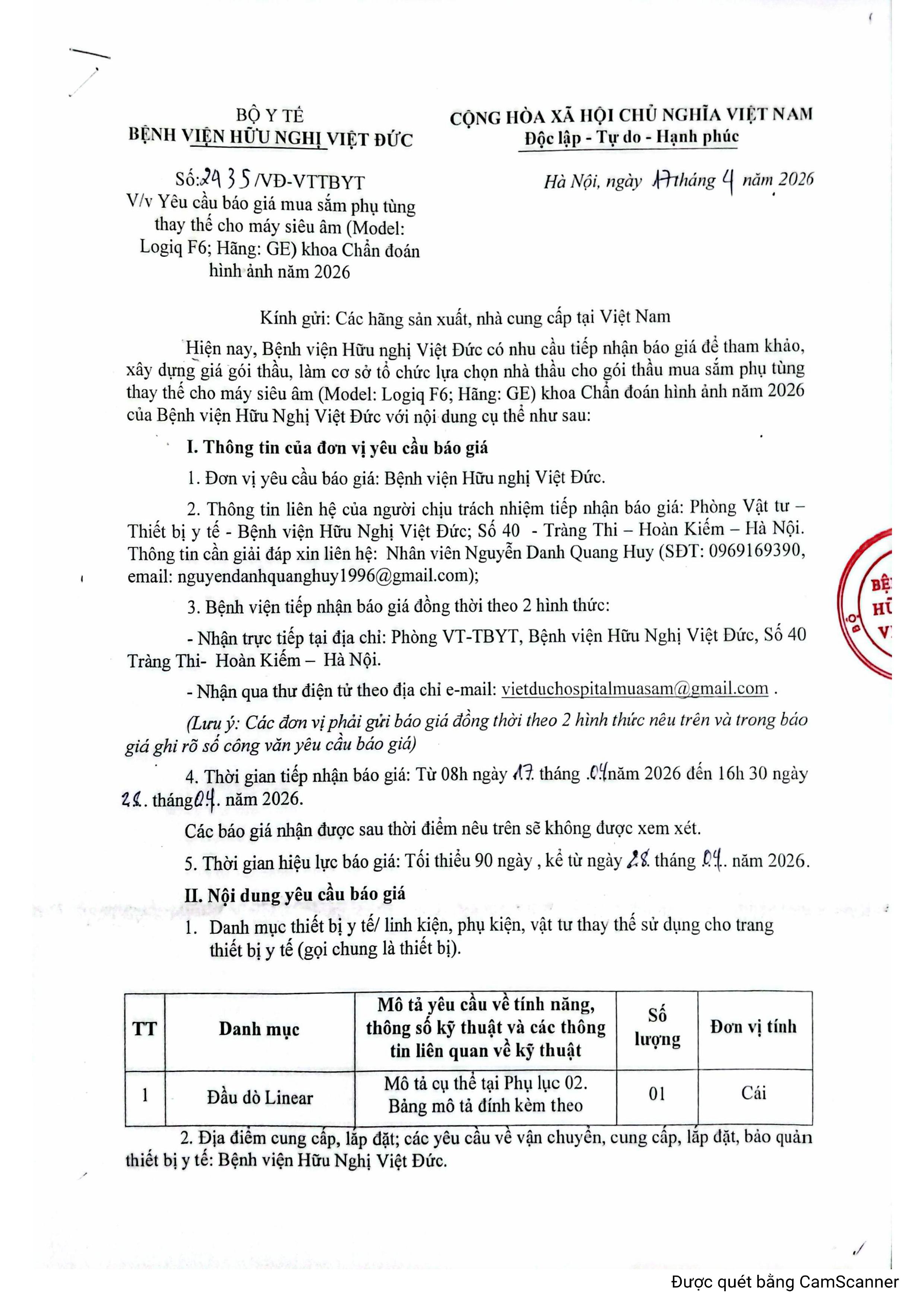 Bệnh viện Hữu nghị Việt Đức có nhu cầu Yêu cầu báo giá mua sắm phụ tùng thay thế cho máy siêu âm (Model: Logiq F6; Hãng: GE) khoa Chẩn đoán hình ảnh năm 2026