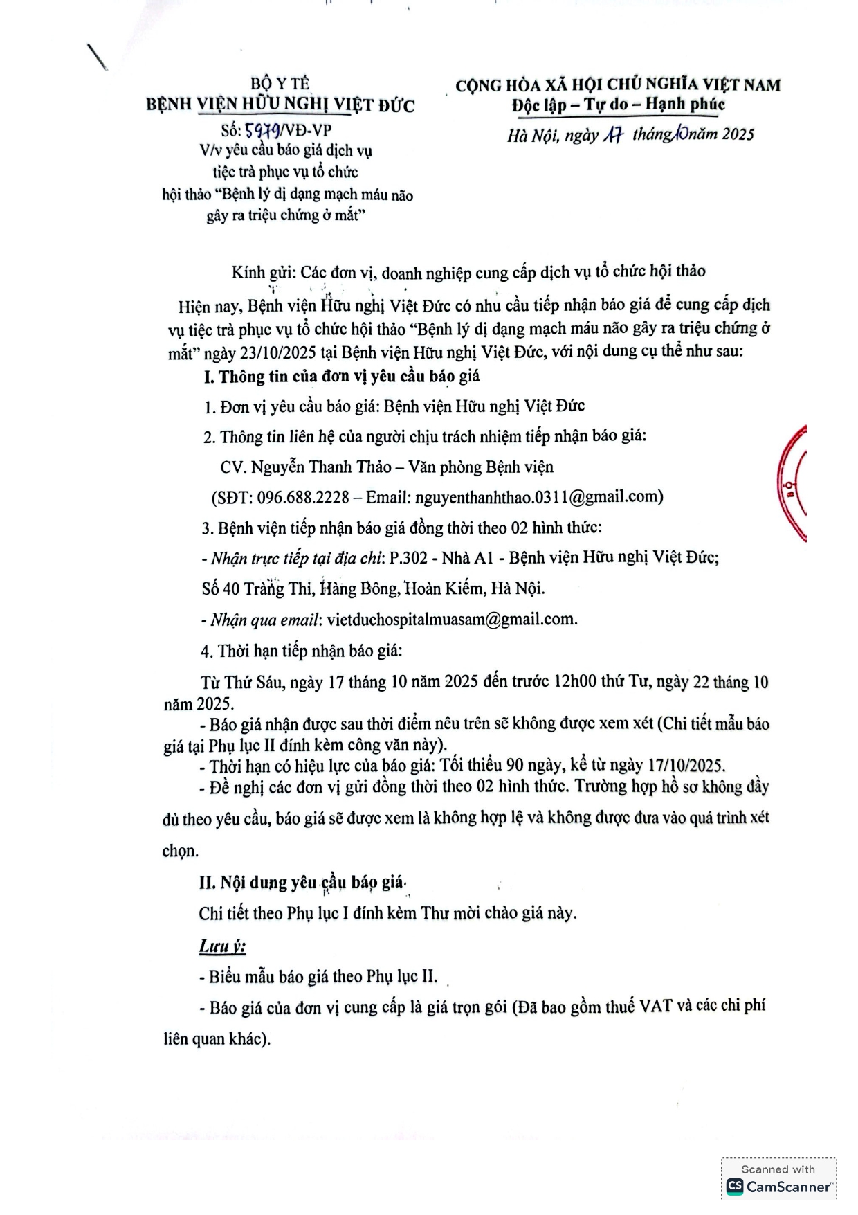 Bệnh viện Hữu nghị Việt Đức mời chào giá cung cấp dịch vụ tiệc trà phục vụ tổ chức hội thảo “Bệnh lý dị dạng mạch máu não gây ra triệu chứng ở mắt”