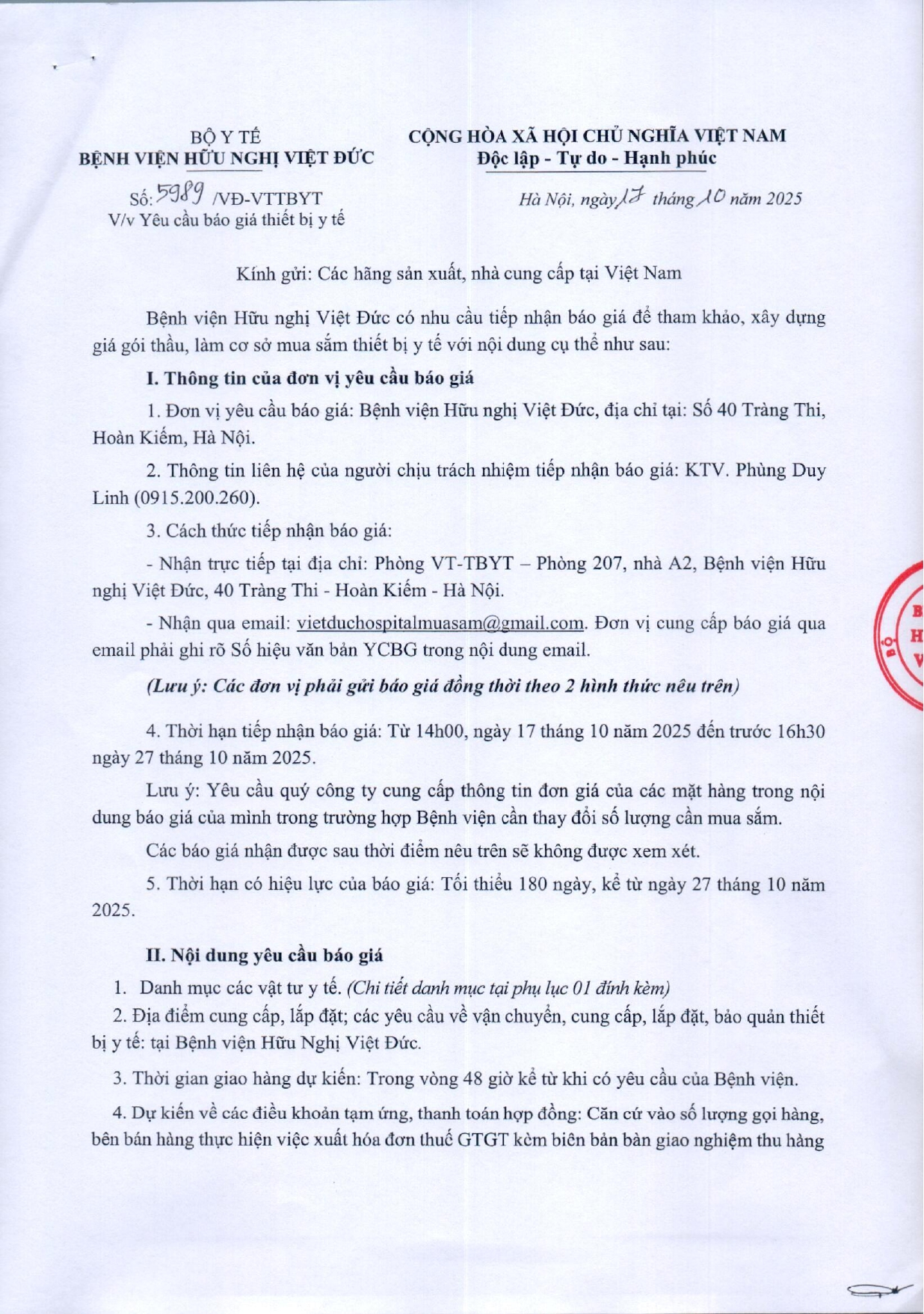 Bệnh viện Hữu nghị Việt Đức mời chào giá thiết bị y tế