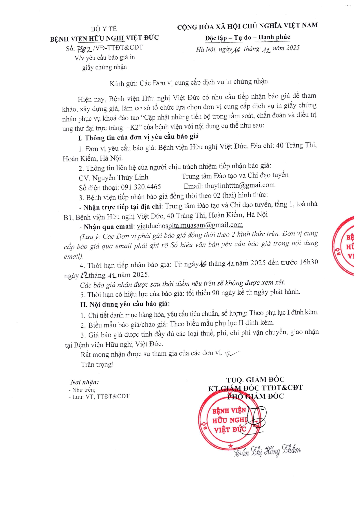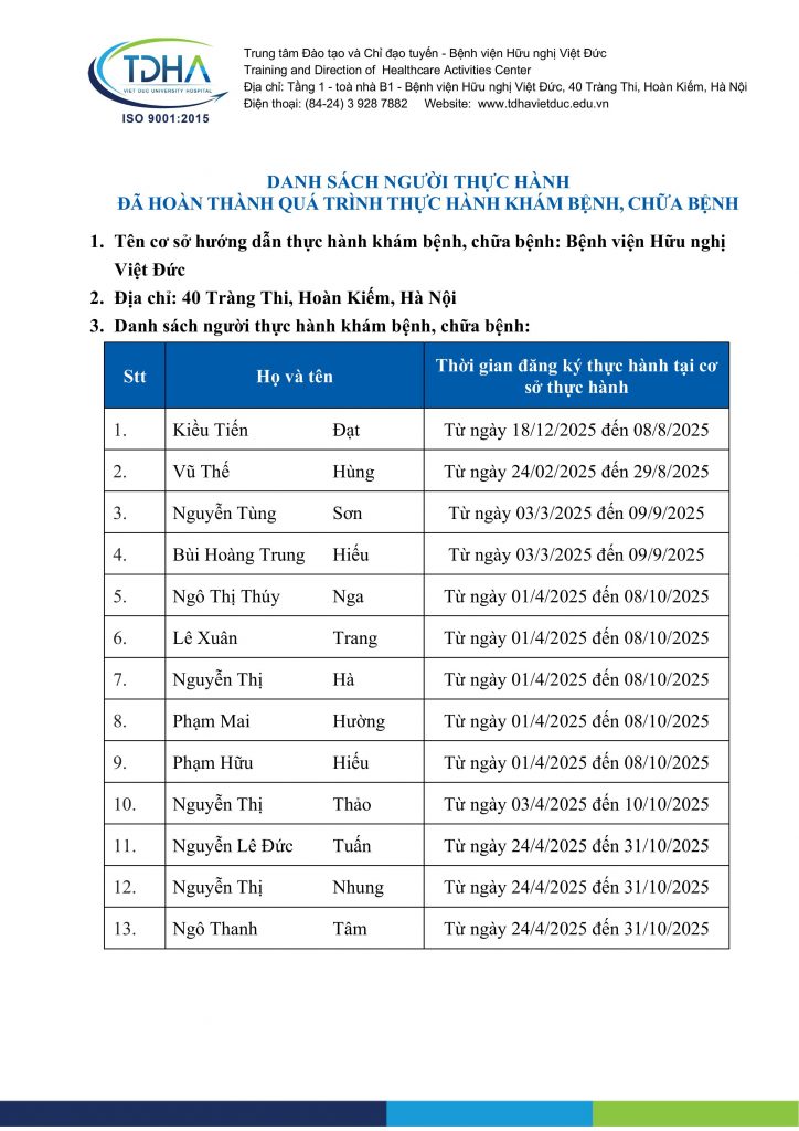 1. Tên cơ sở hướng dẫn thực hành khám bệnh, chữa bệnh: Bệnh viện Hữu nghị Việt Đức
