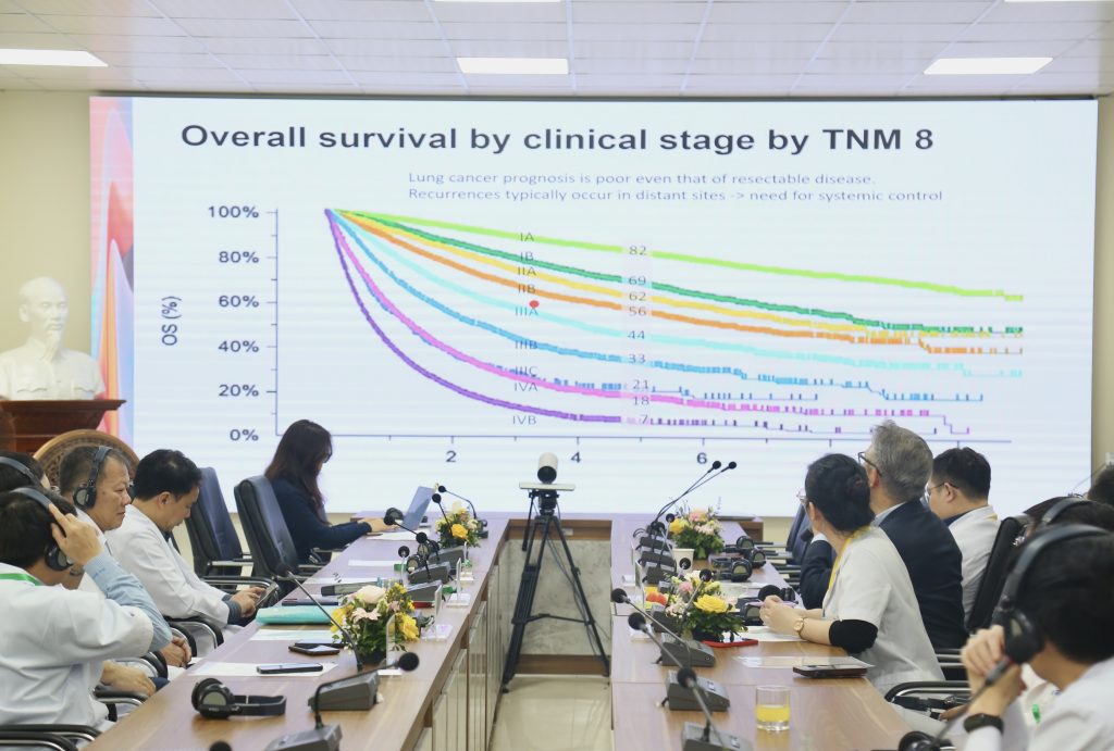 Tại hội nghị, các chuyên gia đã trình bày và trao đổi về các chủ đề: Điều trị tân bổ trợ ung thư phổi không tế bào nhỏ giai đoạn III có thể phẫu thuật; Điều trị đích đối với trường hợp có đột biến EGFR; Hội chẩn các ca bệnh lâm sàng cụ thể. Nhiều ý kiến chuyên môn được thảo luận thẳng thắn, tập trung vào chỉ định phẫu thuật, phối hợp điều trị toàn thân và cá thể hóa phác đồ.