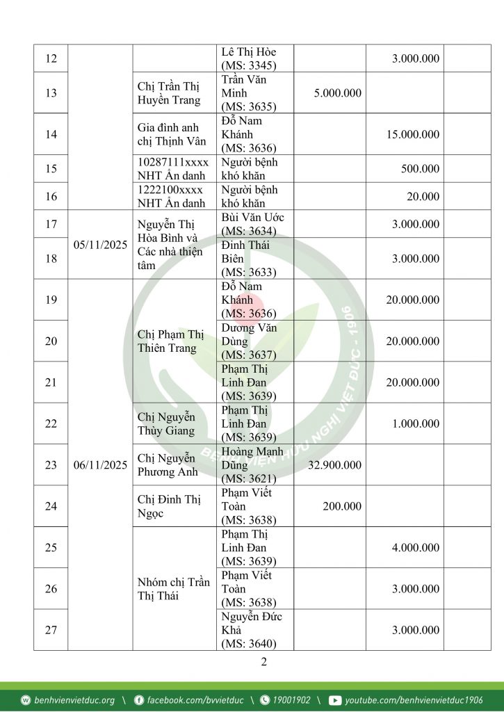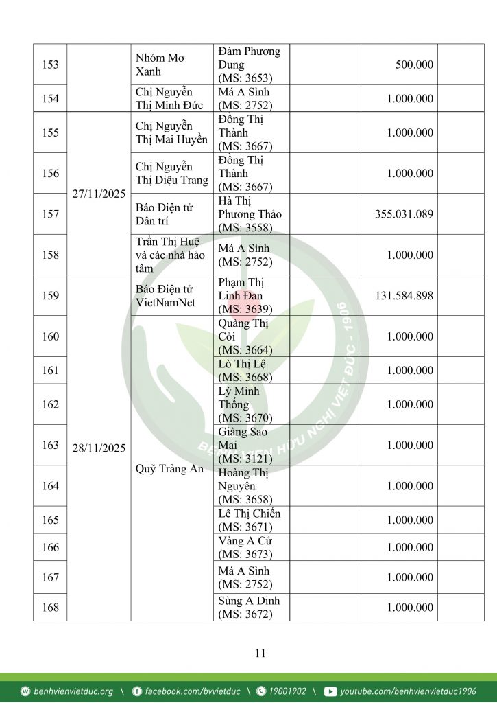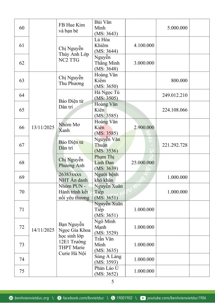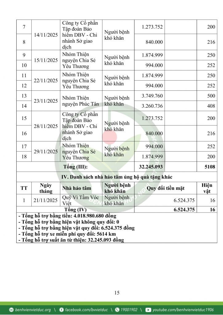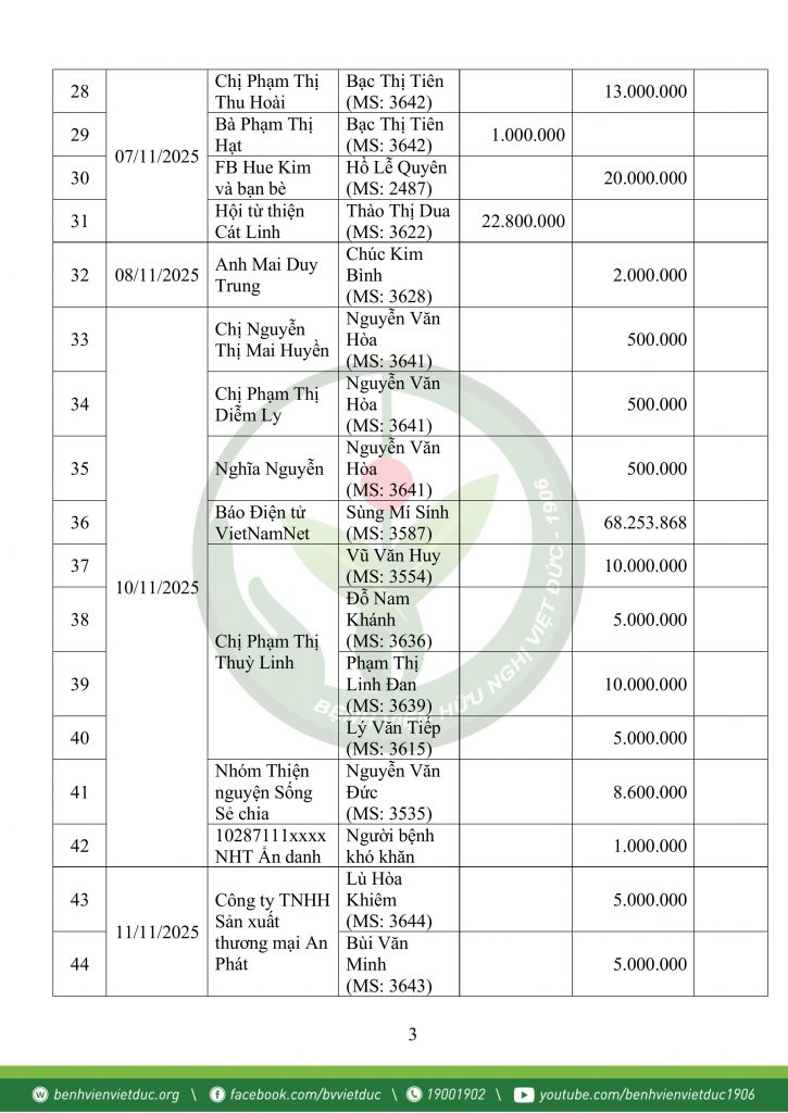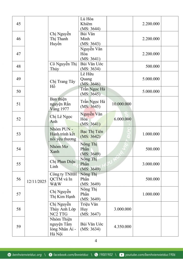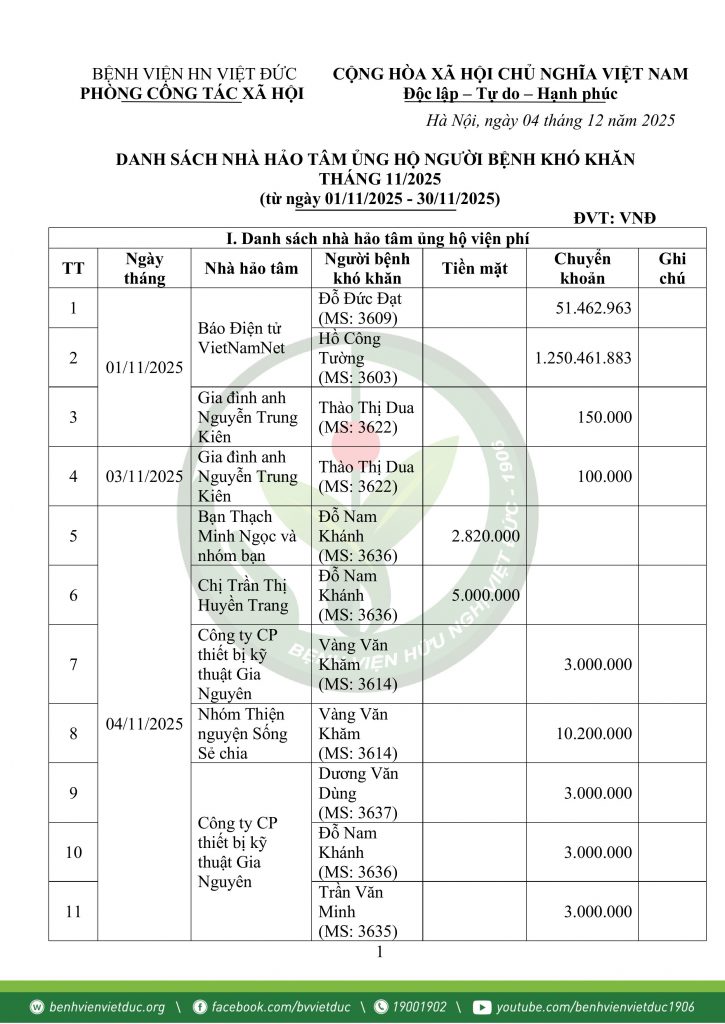 Trong tháng 11/2025, các nhà hảo tâm đã tiếp tục đồng hành cùng Bệnh viện Hữu nghị Việt Đức trong việc hỗ trợ người bệnh có hoàn cảnh khó khăn, với tổng số tiền hỗ trợ là 4.018.980.680 đồng (Bốn tỷ không trăm mười tám triệu chín trăm tám mươi nghìn sáu trăm tám mươi đồng); tổng hỗ trợ bằng hiện vật quy đổi: 6.524.375; tổng hỗ trợ xe miễn phí quy đổi: 5614 km; tổng hỗ trợ suất ăn từ thiện: 32.245.093 đồng (Ba mươi hai triệu hai trăm bốn mươi lăm nghìn chín mươi ba đồng). Số tiền và những món quà vô giá này đã giúp đỡ nhiều người bệnh vượt qua khó khăn trong quá trình điều trị, góp phần nâng cao chất lượng chăm sóc sức khỏe.