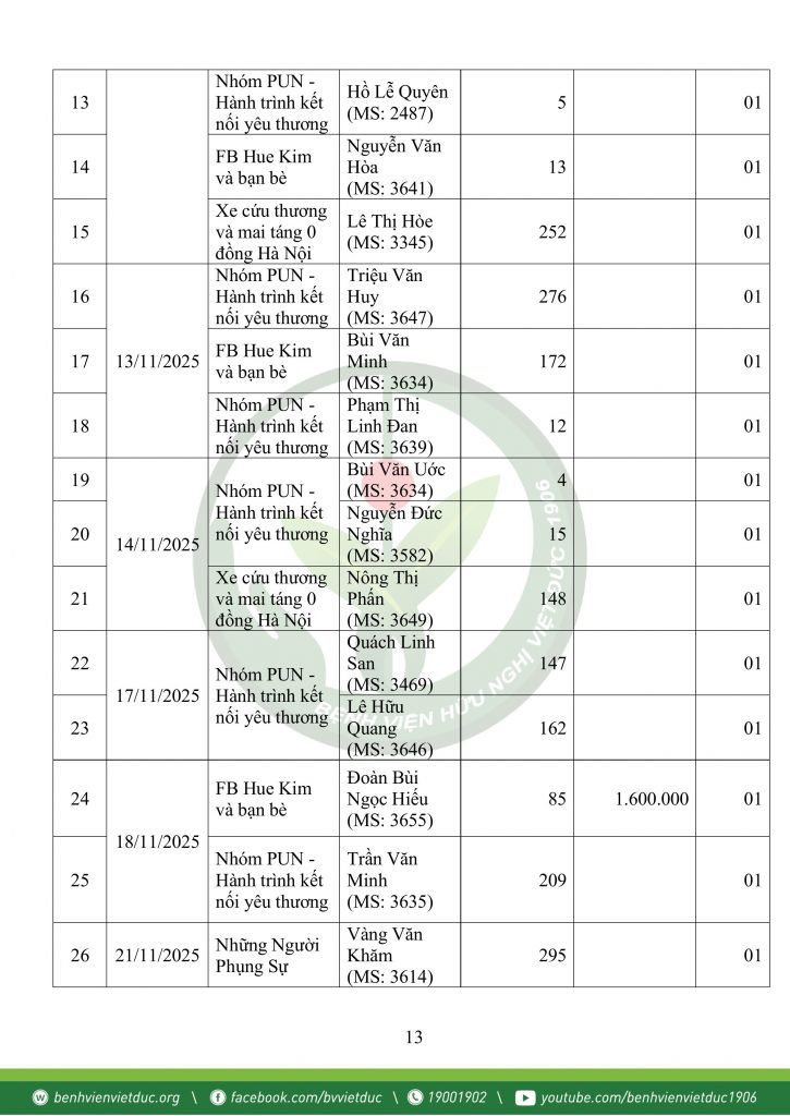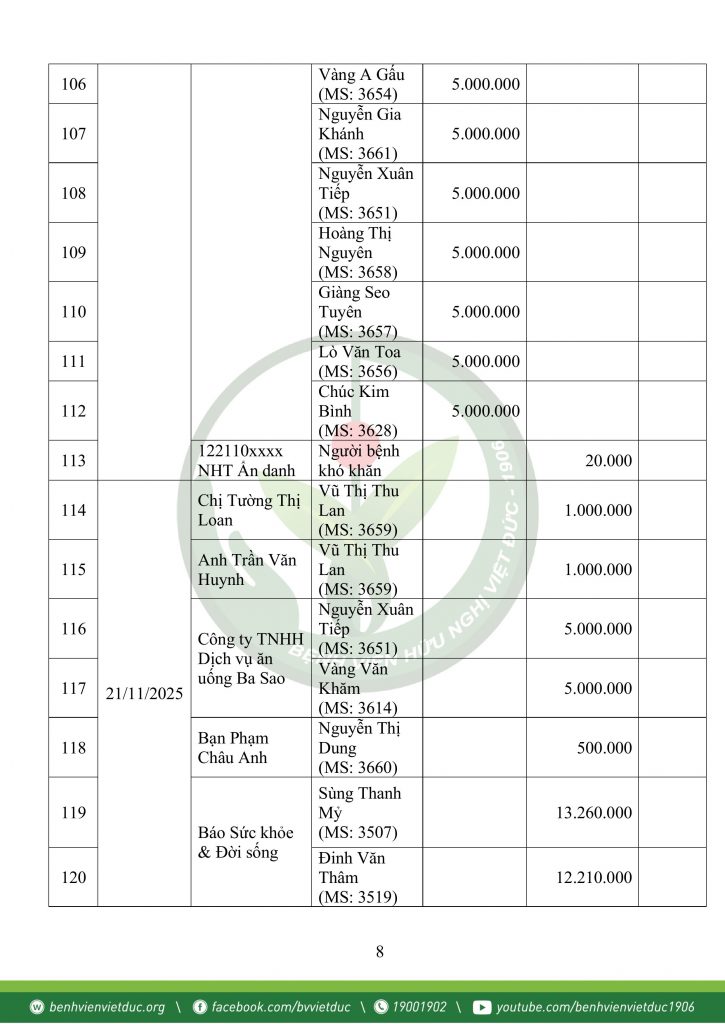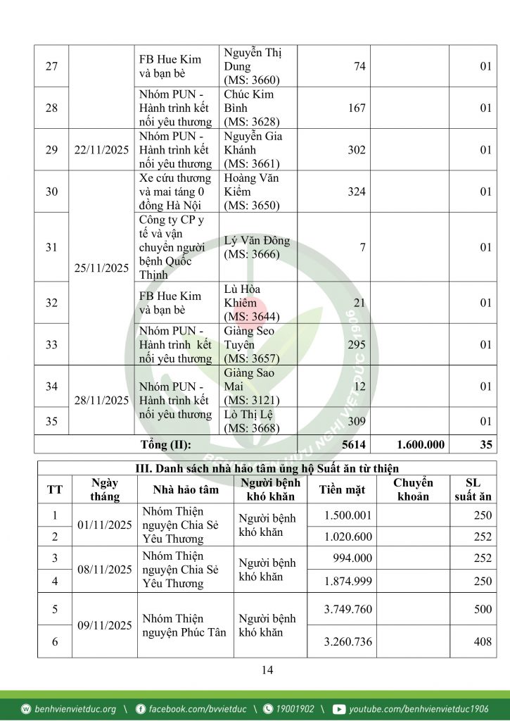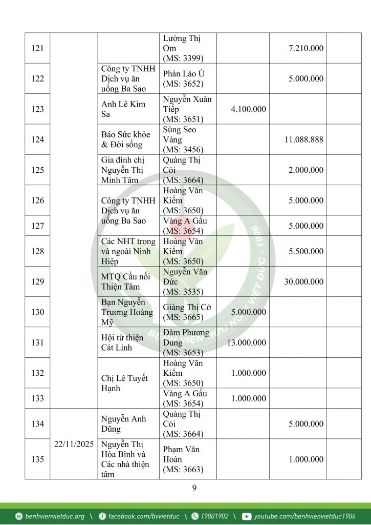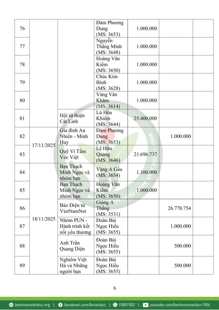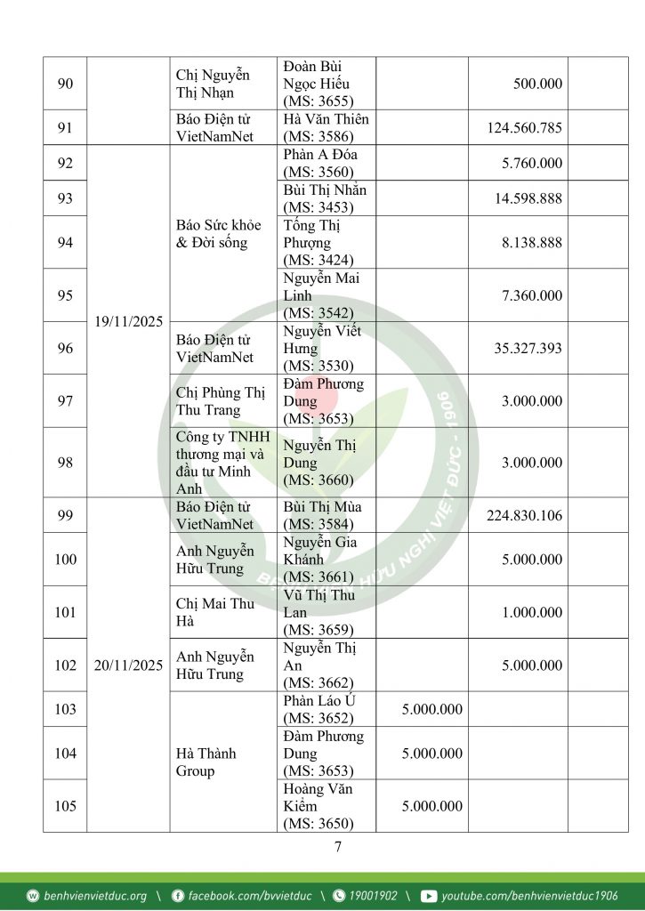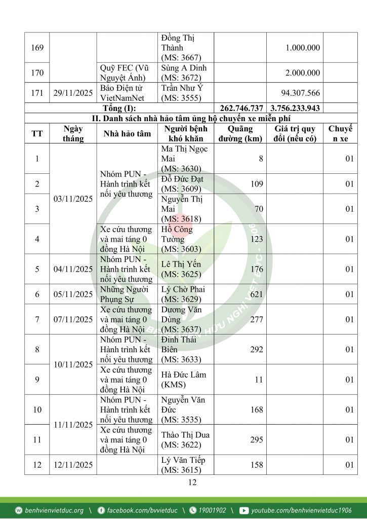 Trong tháng 11/2025, các nhà hảo tâm đã tiếp tục đồng hành cùng Bệnh viện Hữu nghị Việt Đức trong việc hỗ trợ người bệnh có hoàn cảnh khó khăn, với tổng số tiền hỗ trợ là 4.018.980.680 đồng (Bốn tỷ không trăm mười tám triệu chín trăm tám mươi nghìn sáu trăm tám mươi đồng); tổng hỗ trợ bằng hiện vật quy đổi: 6.524.375; tổng hỗ trợ xe miễn phí quy đổi: 5614 km; tổng hỗ trợ suất ăn từ thiện: 32.245.093 đồng (Ba mươi hai triệu hai trăm bốn mươi lăm nghìn chín mươi ba đồng). Số tiền và những món quà vô giá này đã giúp đỡ nhiều người bệnh vượt qua khó khăn trong quá trình điều trị, góp phần nâng cao chất lượng chăm sóc sức khỏe.