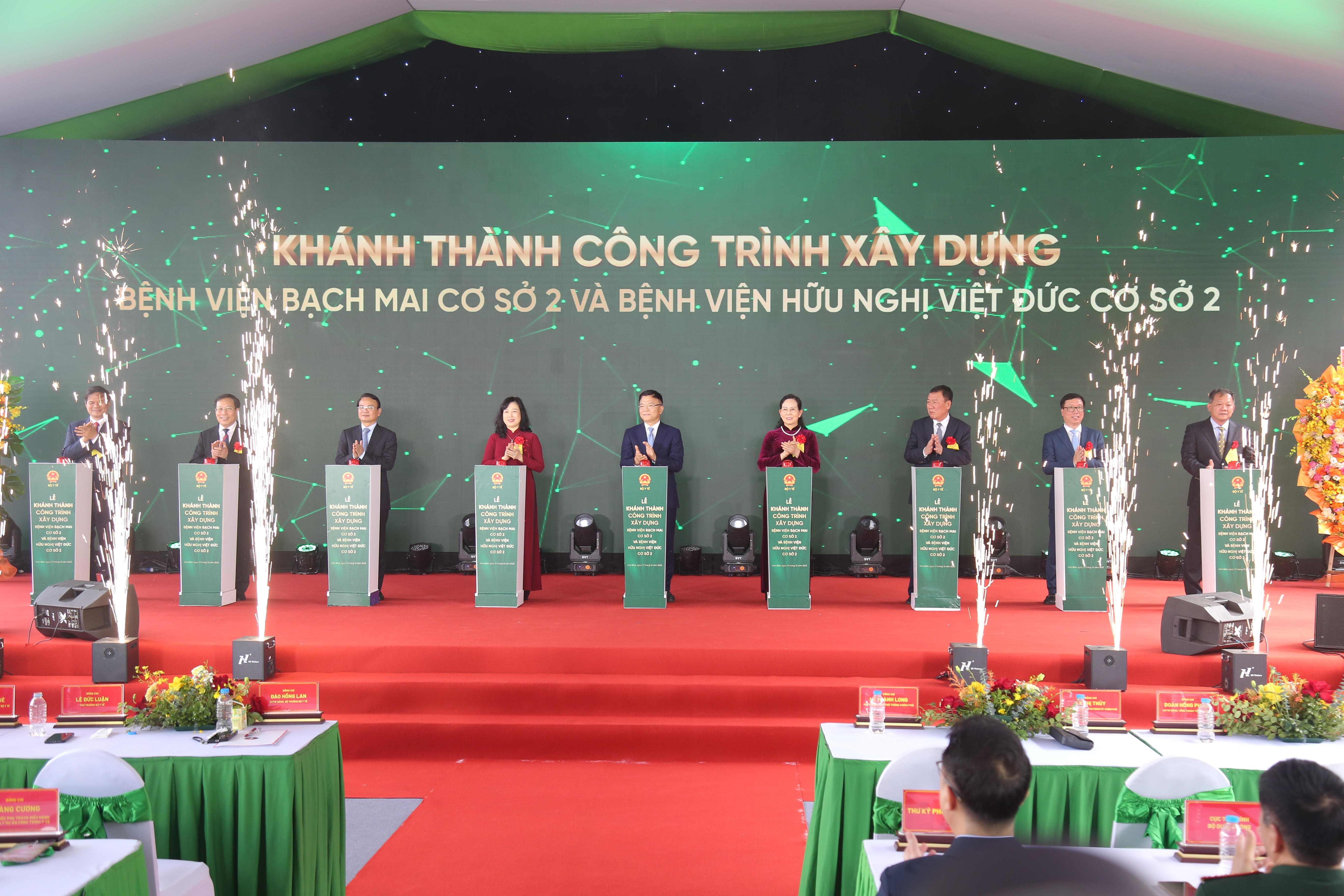 Phó Thủ tướng Lê Thành Long cùng các đại biểu bấm nút khánh thành phần xây dựng công trình Bệnh viện Hữu nghị Việt Đức Cơ sở 2 và Bệnh viện Bạch Mai Cơ sở 2