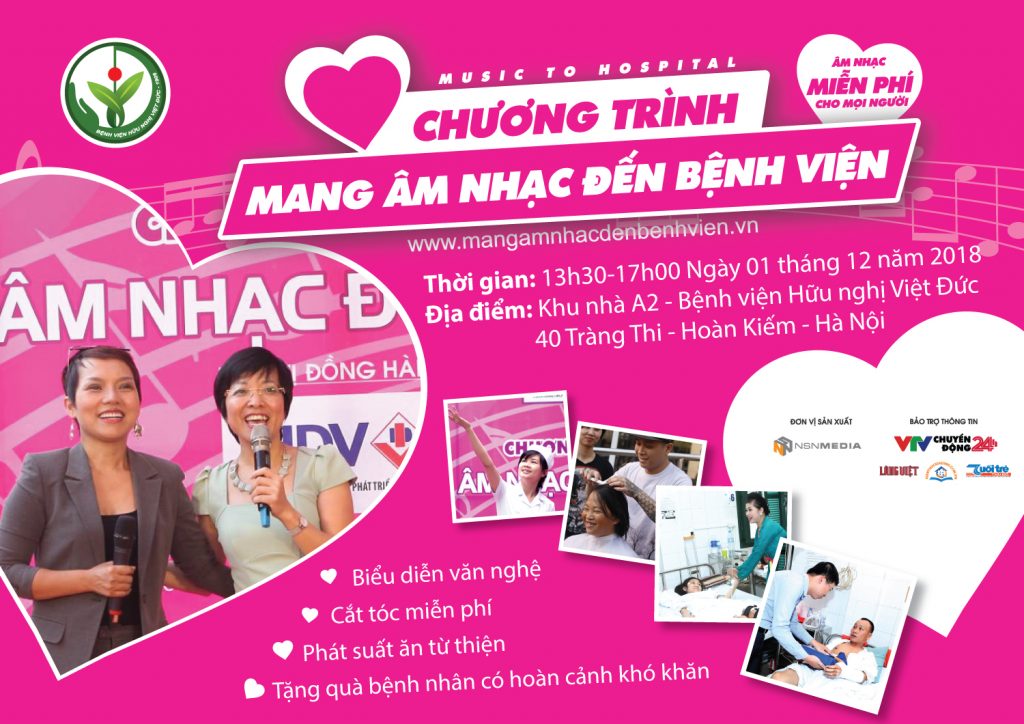Ngày 01/12/2018 Bệnh viện Hữu nghị Việt Đức phối hợp Trung tâm Tình nguyện Quốc gia sẽ tổ chức chương trình “Mang âm nhạc đến bệnh viện”. Đây là bữa tiệc âm nhạc số 192 được tổ chức tại Bệnh viện Hữu nghị Việt Đức.