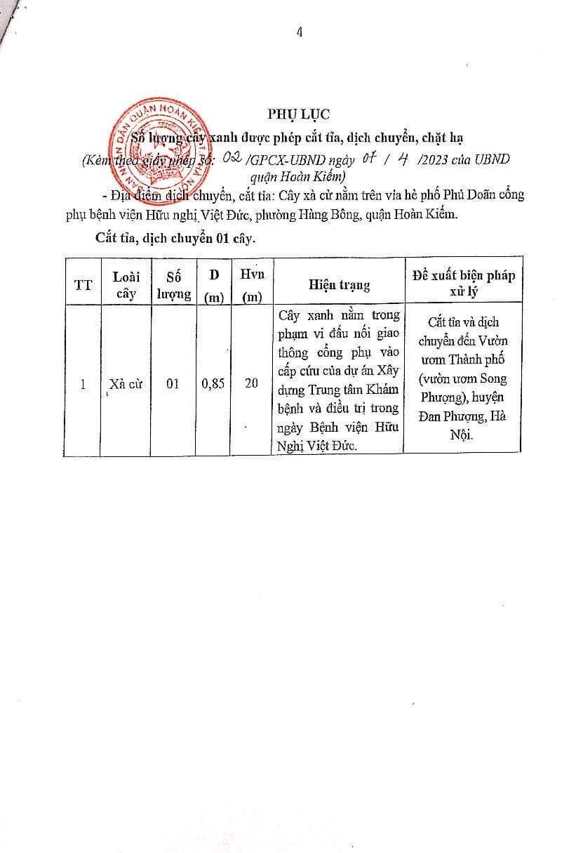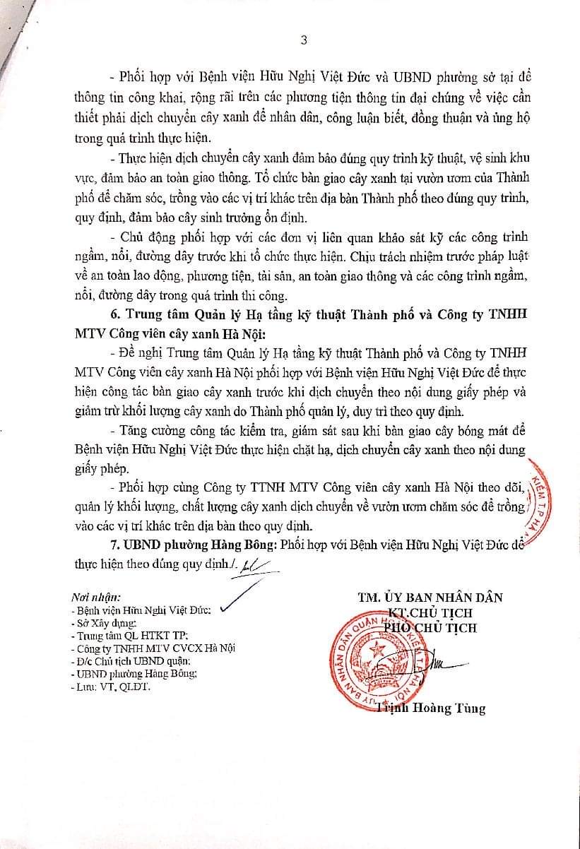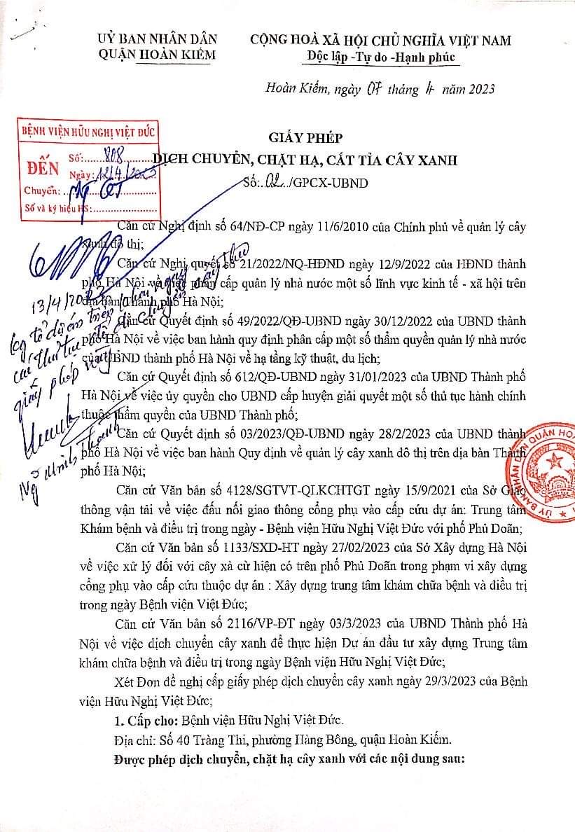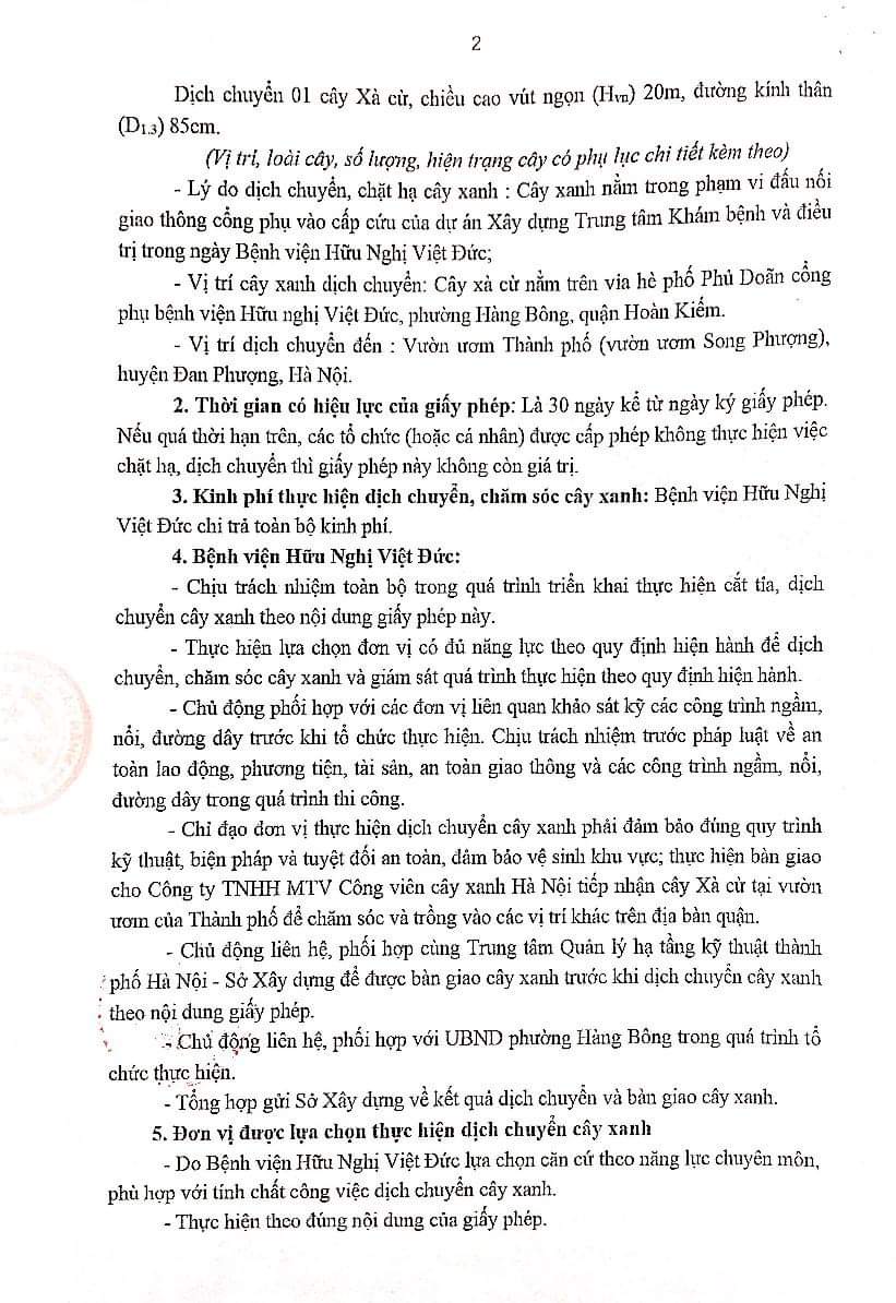 Theo Giấy phép số 02/GPCX-UBND ngày 07/4/2023 của Ủy ban nhân dân quận Hoàn Kiếm về việc Giấy phép dịch chuyển, chặt hạ, cắt tỉa cây xanh. Bệnh viện Hữu nghị Việt Đức (Bệnh viện) chịu trách nhiệm thực hiện việc: cắt tỉa, dịch chuyển cây xanh; lựa chọn đơn vị có đủ năng lực theo quy định hiện hành để dịch chuyển, chăm sóc cây xanh và giám sát quá trình thực hiện theo quy định hiện hành; bàn giao cho Công ty TNHH MTV Công viên cây xanh Hà Nội tiếp nhận cây Xà Cự tại vườn ươm của Thành Phố để chăm sóc và trồng vào các vị trí khác trên địa bàn Quận ….