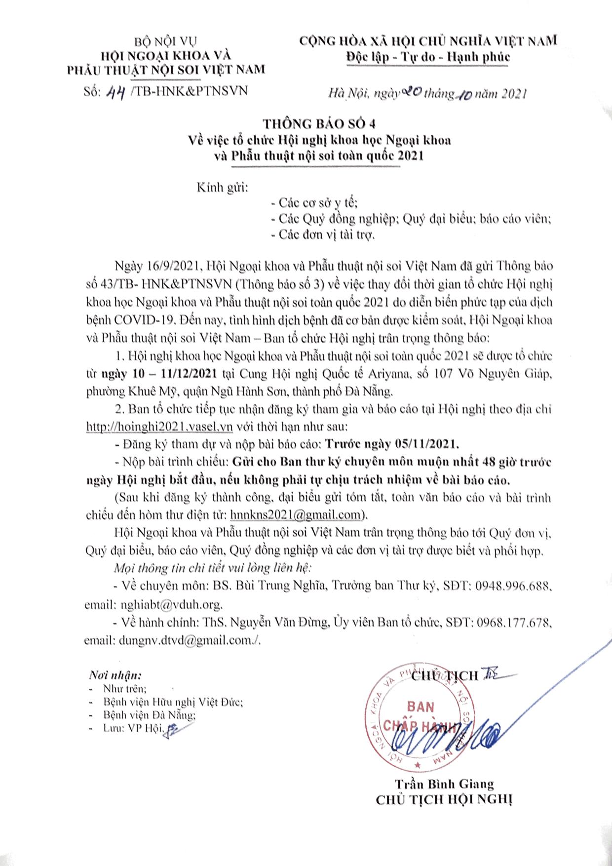 Ngày 16/9/2021, Hội Ngoại khoa và Phẫu thuật nội soi Việt Nam đã gửi Thông báo số 43/TB- HNK&PTNSVN (Thông báo số 3) về việc thay đổi thời gian tổ chức Hội nghị khoa học Ngoại khoa và Phẫu thuật nội soi toàn quốc 2021 do diễn biến phức tạp của dịch bệnh COVID-19. Đến nay, tình hình dịch bệnh đã cơ bản được kiểm soát, Hội Ngoại khoa và Phẫu thuật nội soi Việt Nam – Ban tổ chức Hội nghị trân trọng thông báo: