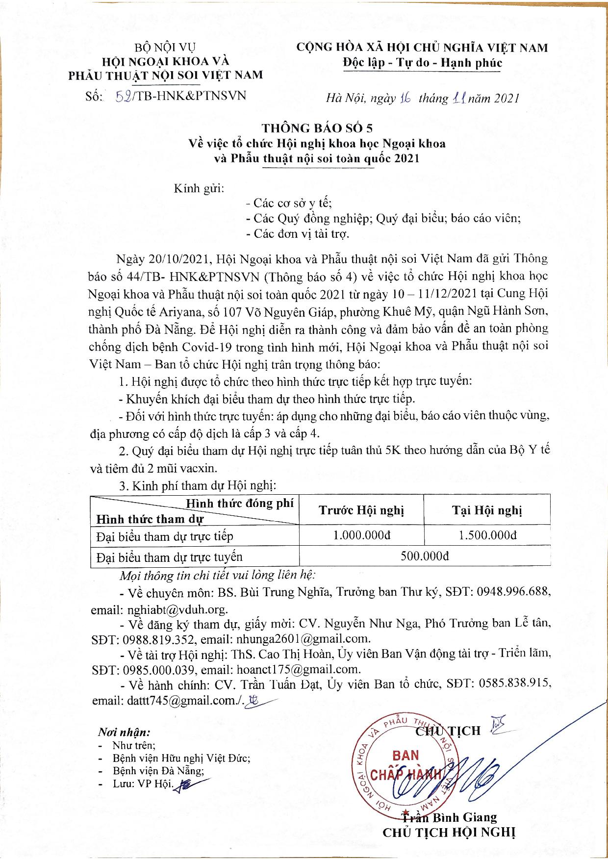 Ngày 20/10/2021, Hội Ngoại khoa và Phẫu thuật nội soi Việt Nam đã gửi Thông báo số 44/TB- HNK&PTNSVN (Thông báo số 4) về việc tổ chức Hội nghị khoa học Ngoại khoa và Phẫu thuật nội soi toàn quốc 2021 từ ngày 10 – 11/12/2021 tại Cung Hội nghị Quốc tế Ariyana, số 107 Võ Nguyên Giáp, phường Khuê Mỹ, quận Ngũ Hành Sơn, thành phố Đà Nẵng. Để Hội nghị diễn ra thành công và đảm bảo vấn đề an toàn phòng chống dịch bệnh Covid-19 trong tình hình mới, Hội Ngoại khoa và Phẫu thuật nội soi Việt Nam – Ban tổ chức Hội nghị trân trọng thông báo: