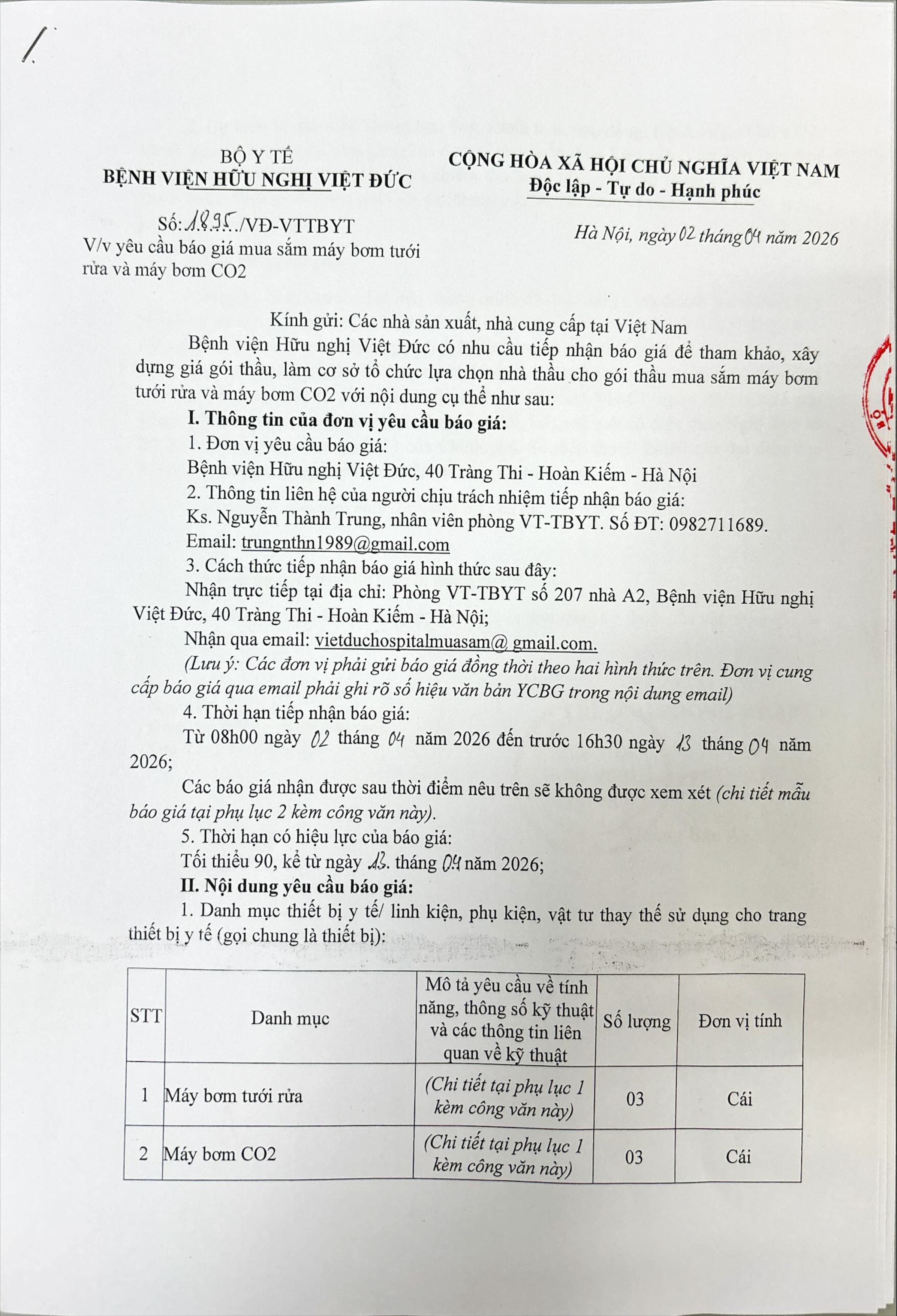 Thư mời cung cấp báo giá của Bệnh viện Hữu nghị Việt Đức