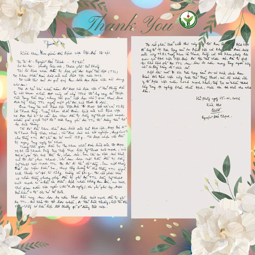 Tôi rất phấn khởi viết thư này gửi tới Ban Giám đốc Bệnh viện Hữu nghị Việt Đức để bày tỏ sự trân trọng, cảm ơn bệnh viện, khoa Chẩn đoán hình ảnh cùng PGS.TS Lê Thanh Dũng và các khoa, phòng liên quan của Bệnh viện Hữu nghị Việt Đức đã tận tình chăm sóc, điều trị, giúp tôi khỏi bệnh phì đại tuyến tiền liệt sau hơn 10 năm mang trong người cùng nỗi lo lắng không dễ chia sẻ.