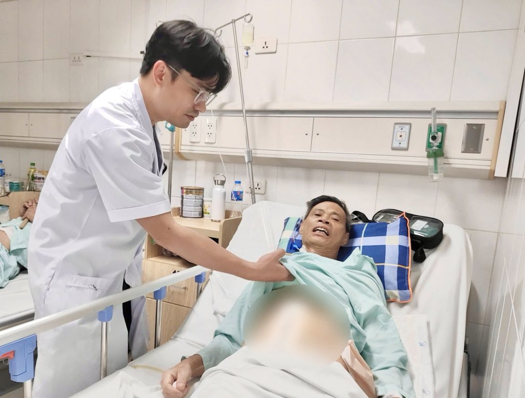 TS.BS Cao Mạnh Thấu – Khoa Ung bướu và xạ trị, Bệnh viện Hữu nghị Việt Đức thăm khám cho người bệnh sau phẫu thuật